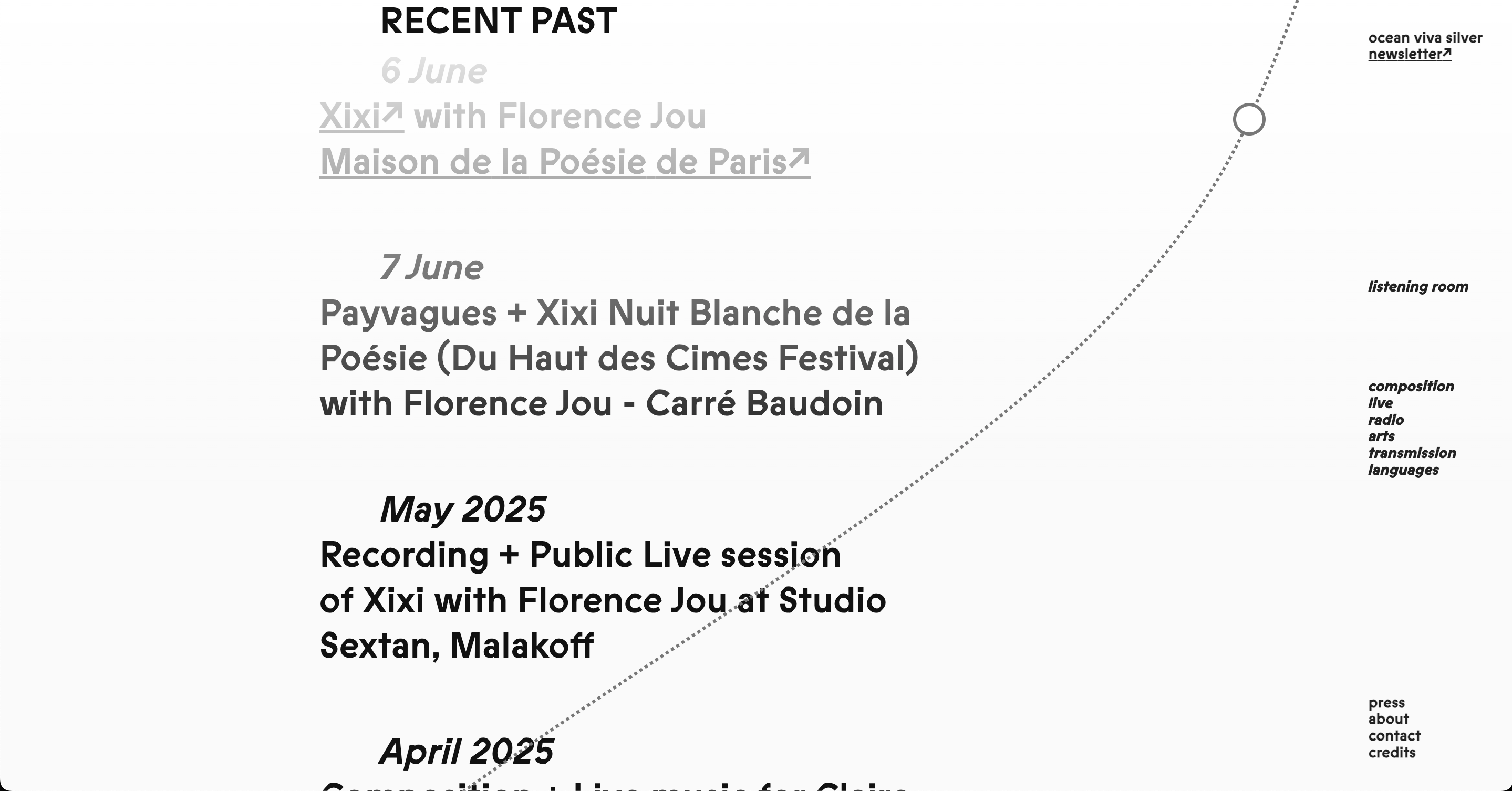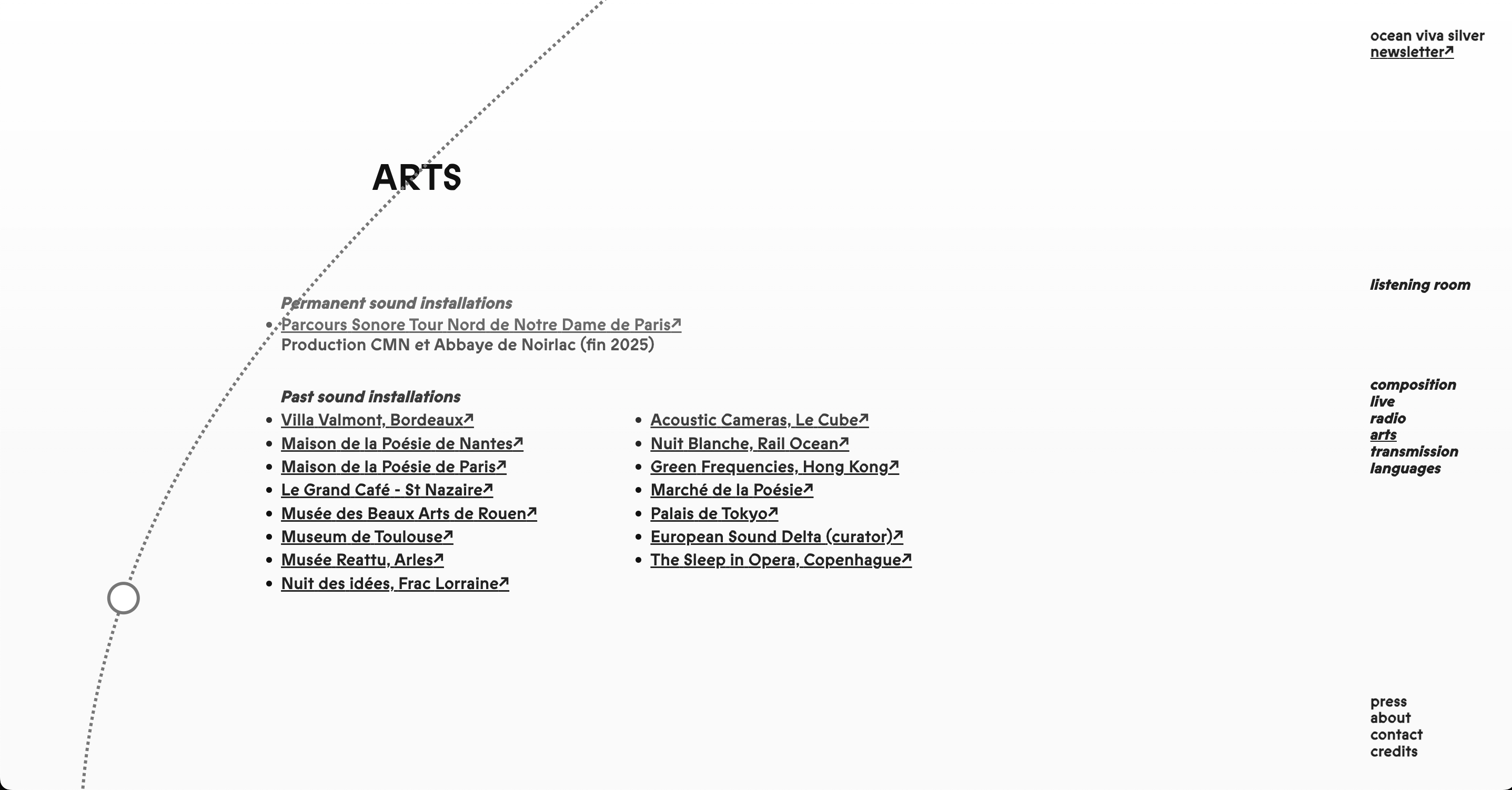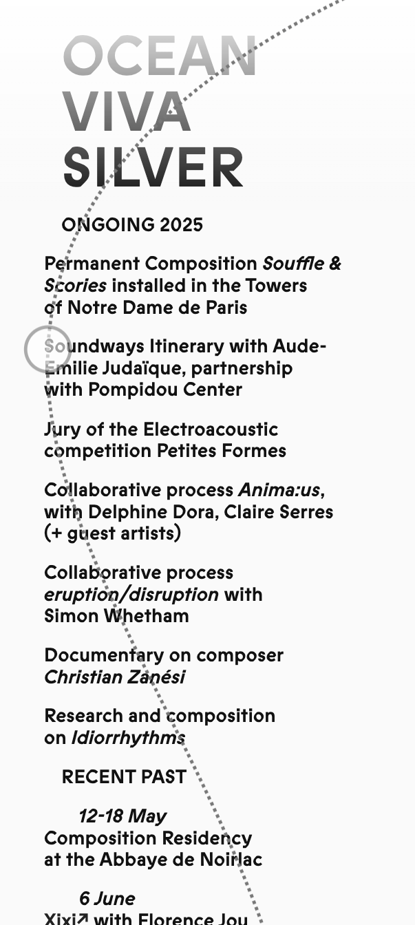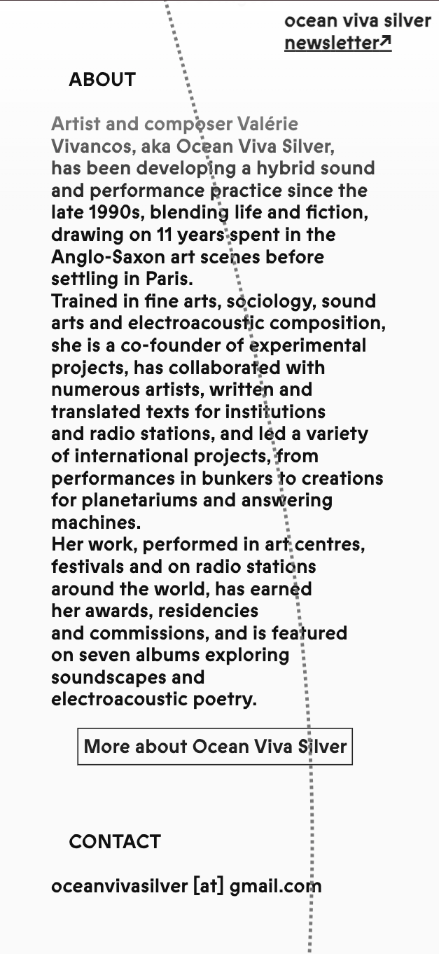 Sur la page d’accueil au fond blanc, le temps est celui de la personne qui explore, consulte les actualités et mesure l’étendue du travail d’Ocean Viva Silver. Forme inhabituelle pour un site web, suivant en parallaxe le défilement de la navigation, une courbe verticale ponctuée de disques semble inviter à une action, une interaction. Une fois celle-ci engagée, l’espace blanc lumière devient chambre d’écoute sombre, propice à l’attention : un extrait sonore se déclenche. Telle une scénographie contemporaine où la lumière, les interprètes et le décor évoluent selon les scènes ou les situations, la lecture du son entraîne l'apparition d‘une interface graphique singulière conçue pour accompagner l’écoute. Dans un espace numérique, la lecture du son introduit un temps complémentaire à celui de la navigation, la temporalité du son qui se déploie. Pour l’accompagner, le choix a été de travailler à partir des mots du texte déjà présents, et de leur donner, par une spatialisation animée programmée, une nouvelle atmosphère. Le dégradé du fond varie discrètement selon la profondeur du défilement. Les approches du caractère typographique accidenté se dérèglent aléatoirement ; les vagues, nappes, voix et autres crépitements sonores emportent les lettres, parfois selon le tempo, parfois selon le spectre de fréquences. Jamais ne se reproduira exactement la même série de mouvements. Une poésie typographique répondant à un autre versant du travail de Valérie Vivancos, celui de l’écriture. La navigation reste possible pendant l’écoute, permettant d’explorer d’autres compositions sonores. De la lecture à l’écoute, de l’écoute au texte, la visite s’achève, nous l’espérons, une fois tous les sons découverts et les mots parcourus.