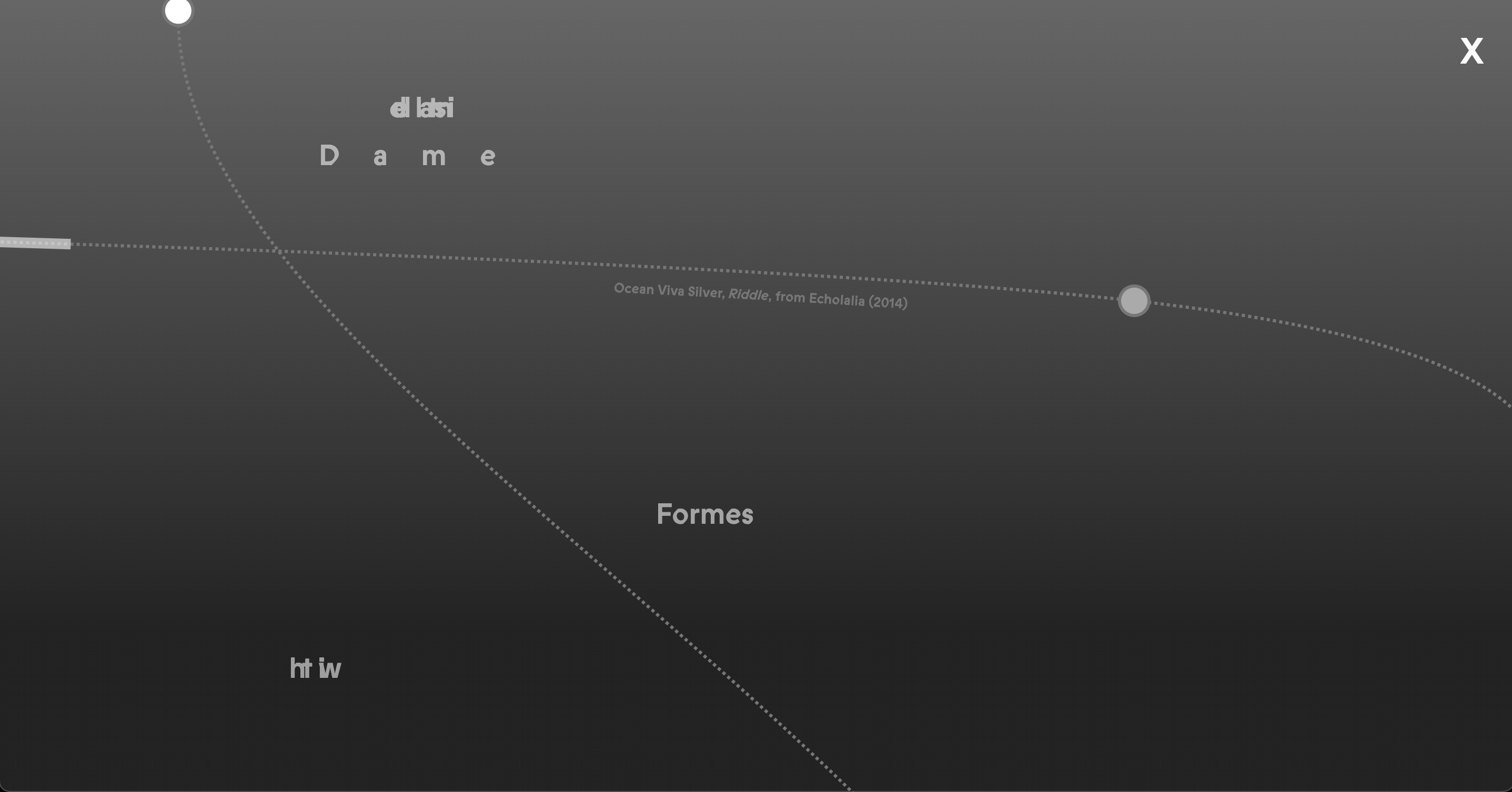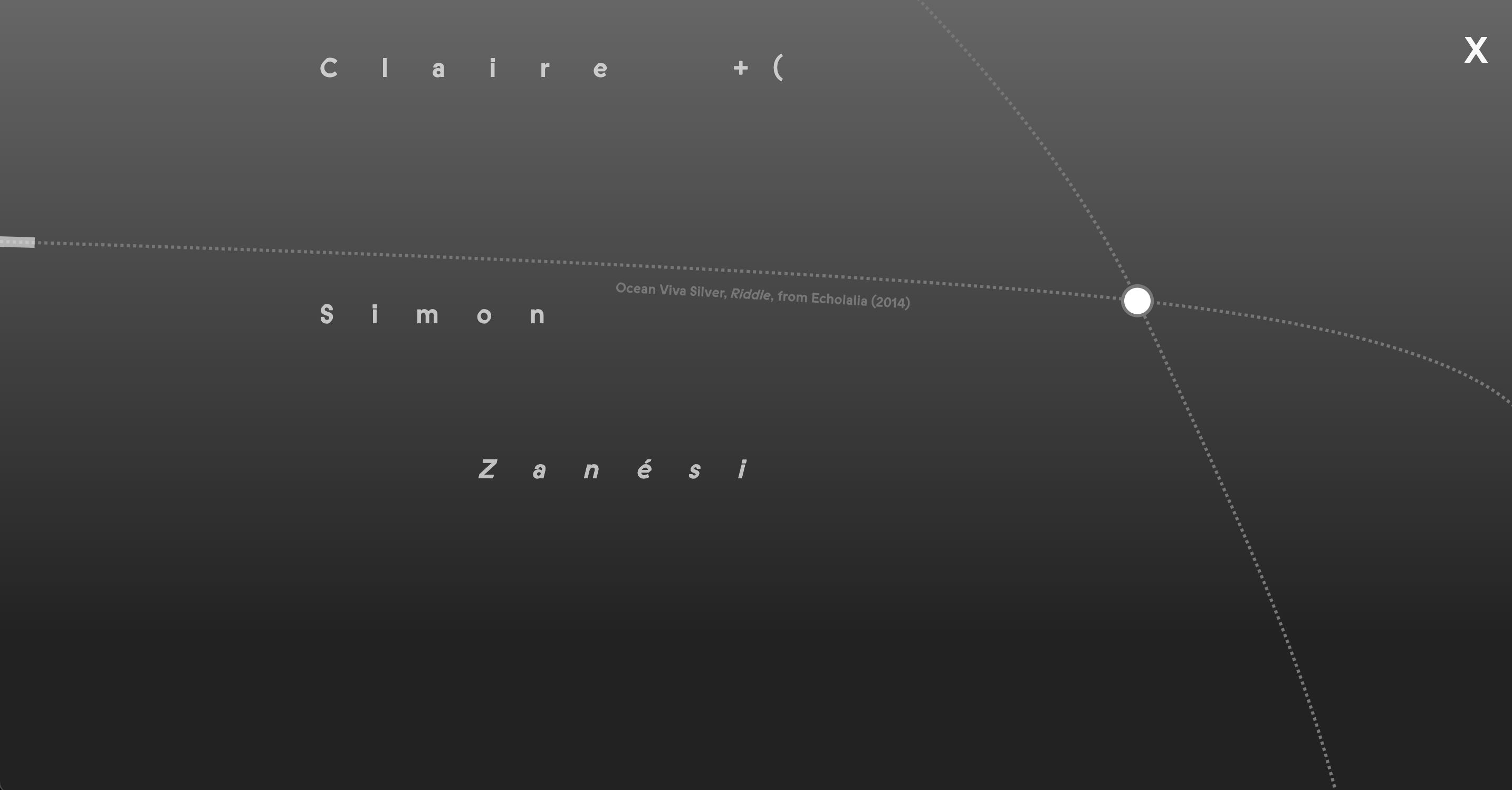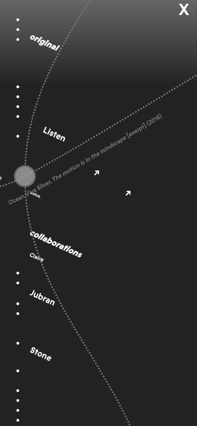Sur la page d’accueil au fond blanc, le temps est celui de la personne qui explore, consulte les actualités et mesure l’étendue du travail d’Ocean Viva Silver. Forme inhabituelle pour un site web, suivant en parallaxe le défilement de la navigation, une courbe verticale ponctuée de disques semble inviter à une action, une interaction. Une fois celle-ci engagée, l’espace blanc lumière devient chambre d’écoute sombre, propice à l’attention : un extrait sonore se déclenche. Telle une scénographie contemporaine où la lumière, les interprètes et le décor évoluent selon les scènes ou les situations, la lecture du son entraîne l'apparition d‘une interface graphique singulière conçue pour accompagner l’écoute. Dans un espace numérique, la lecture du son introduit un temps complémentaire à celui de la navigation, la temporalité du son qui se déploie. Pour l’accompagner, le choix a été de travailler à partir des mots du texte déjà présents, et de leur donner, par une spatialisation animée programmée, une nouvelle atmosphère. Le dégradé du fond varie discrètement selon la profondeur du défilement. Les approches du caractère typographique accidenté se dérèglent aléatoirement ; les vagues, nappes, voix et autres crépitements sonores emportent les lettres, parfois selon le tempo, parfois selon le spectre de fréquences. Jamais ne se reproduira exactement la même série de mouvements. Une poésie typographique répondant à un autre versant du travail de Valérie Vivancos, celui de l’écriture. La navigation reste possible pendant l’écoute, permettant d’explorer d’autres compositions sonores. De la lecture à l’écoute, de l’écoute au texte, la visite s’achève, nous l’espérons, une fois tous les sons découverts et les mots parcourus.