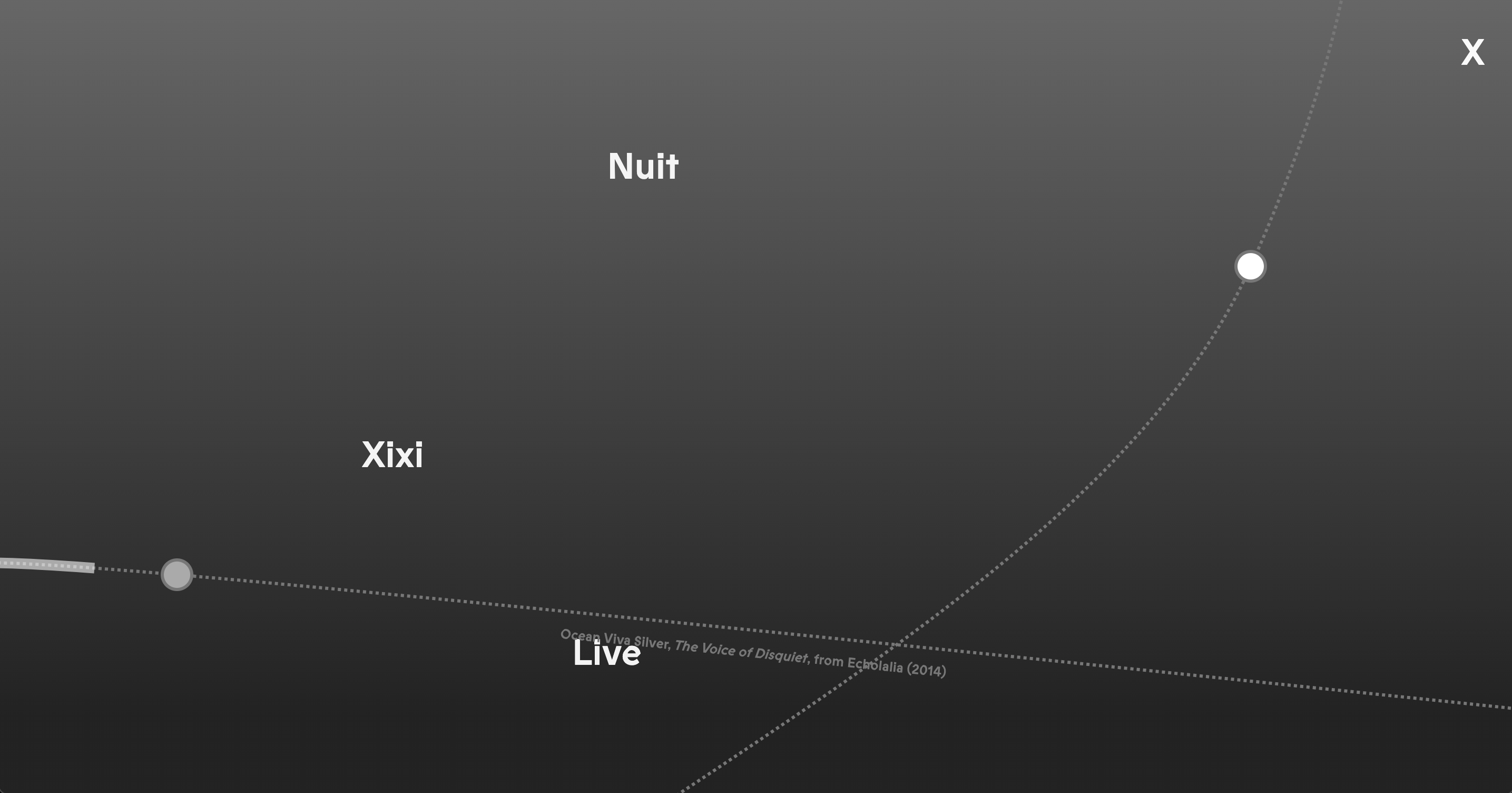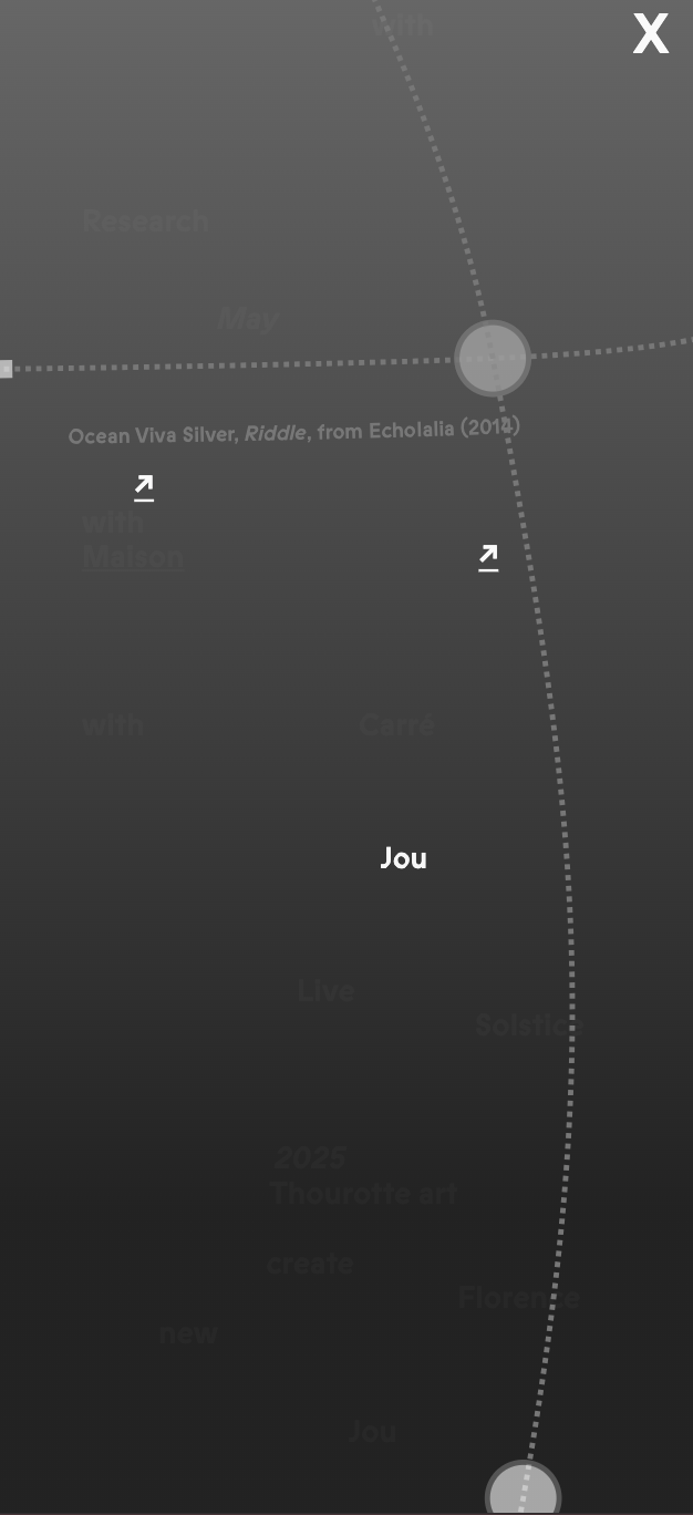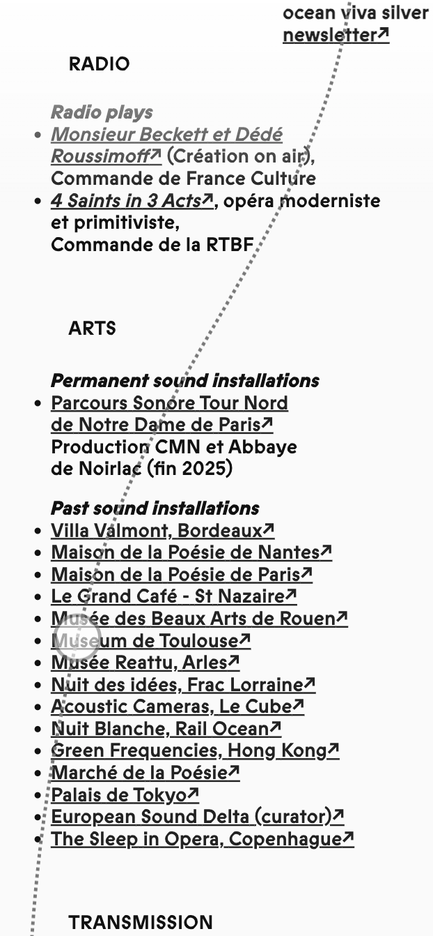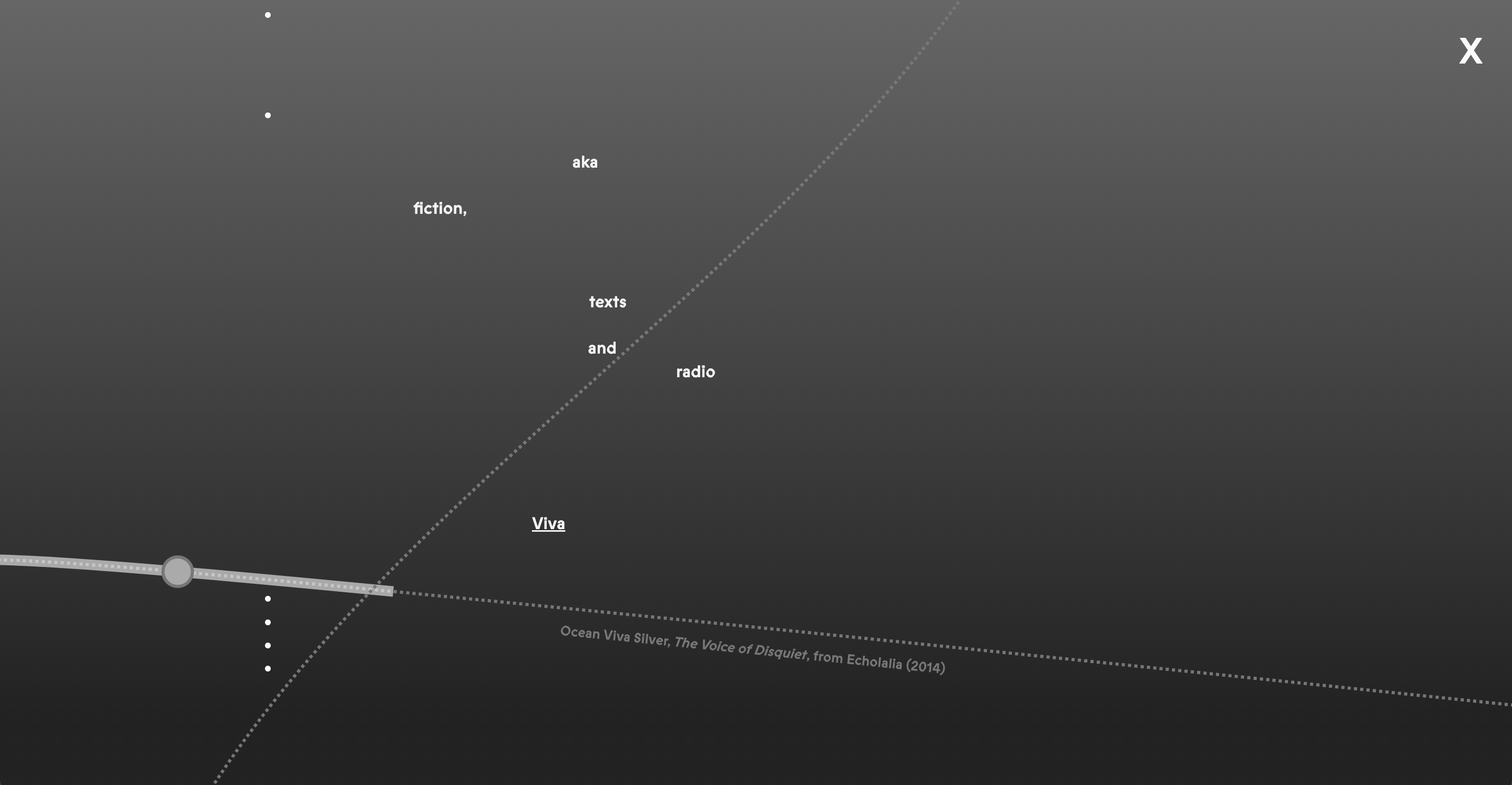 Sur la page d’accueil au fond blanc, le temps est celui de la personne qui explore, consulte les actualités et mesure l’étendue du travail d’Ocean Viva Silver. Forme inhabituelle pour un site web, suivant en parallaxe le défilement de la navigation, une courbe verticale ponctuée de disques semble inviter à une action, une interaction. Une fois celle-ci engagée, l’espace blanc lumière devient chambre d’écoute sombre, propice à l’attention : un extrait sonore se déclenche. Telle une scénographie contemporaine où la lumière, les interprètes et le décor évoluent selon les scènes ou les situations, la lecture du son entraîne l'apparition d‘une interface graphique singulière conçue pour accompagner l’écoute. Dans un espace numérique, la lecture du son introduit un temps complémentaire à celui de la navigation, la temporalité du son qui se déploie. Pour l’accompagner, le choix a été de travailler à partir des mots du texte déjà présents, et de leur donner, par une spatialisation animée programmée, une nouvelle atmosphère. Le dégradé du fond varie discrètement selon la profondeur du défilement. Les approches du caractère typographique accidenté se dérèglent aléatoirement ; les vagues, nappes, voix et autres crépitements sonores emportent les lettres, parfois selon le tempo, parfois selon le spectre de fréquences. Jamais ne se reproduira exactement la même série de mouvements. Une poésie typographique répondant à un autre versant du travail de Valérie Vivancos, celui de l’écriture. La navigation reste possible pendant l’écoute, permettant d’explorer d’autres compositions sonores. De la lecture à l’écoute, de l’écoute au texte, la visite s’achève, nous l’espérons, une fois tous les sons découverts et les mots parcourus.